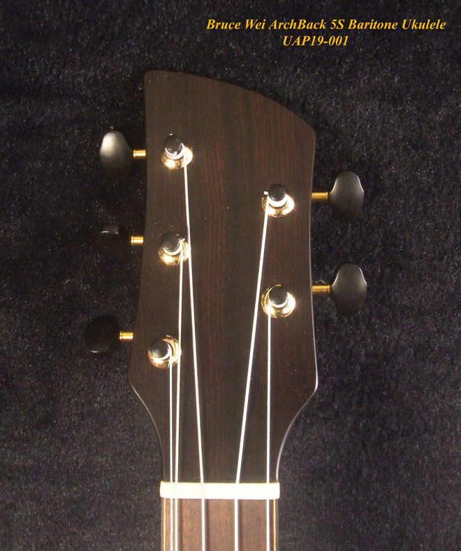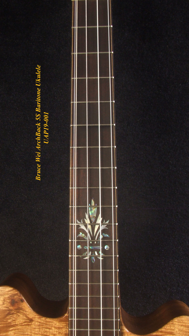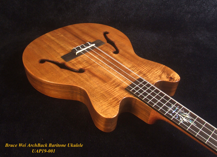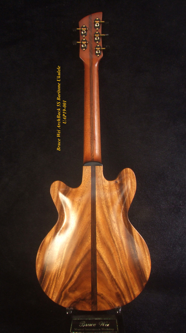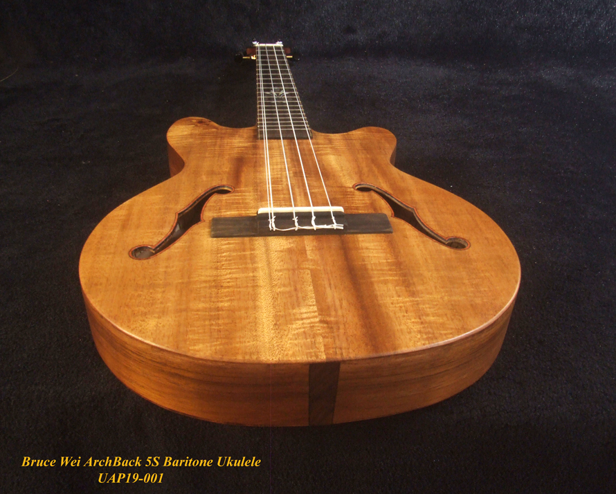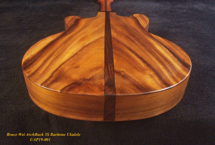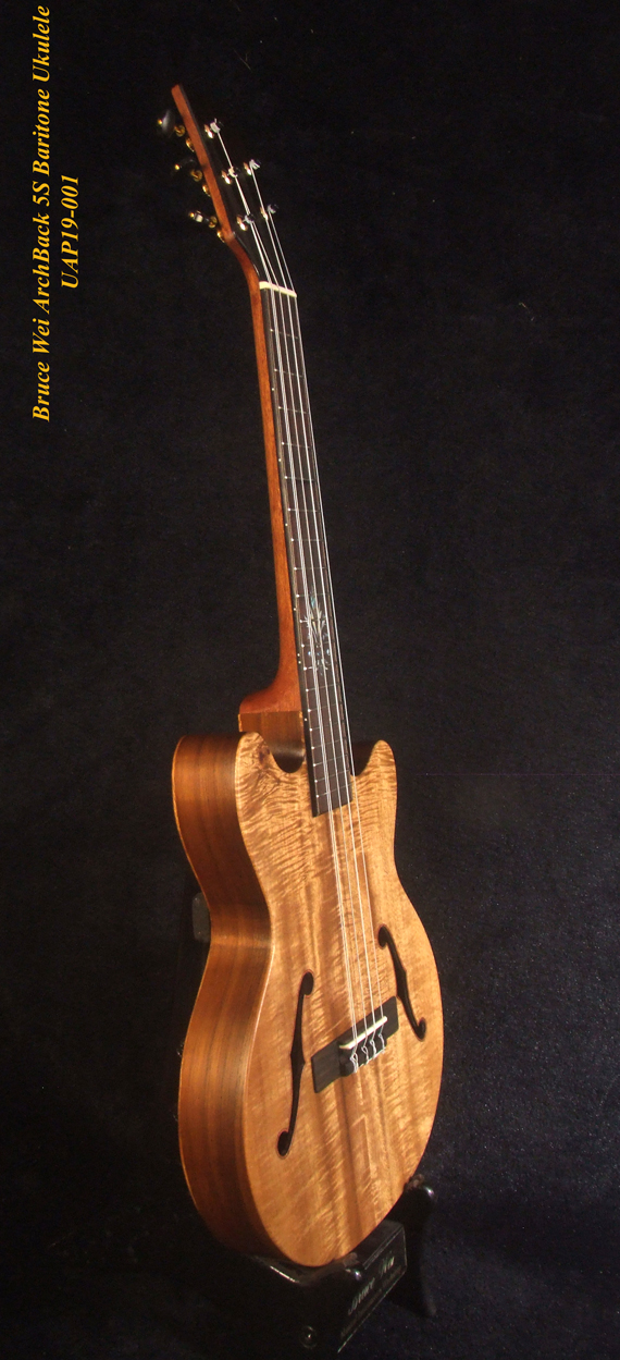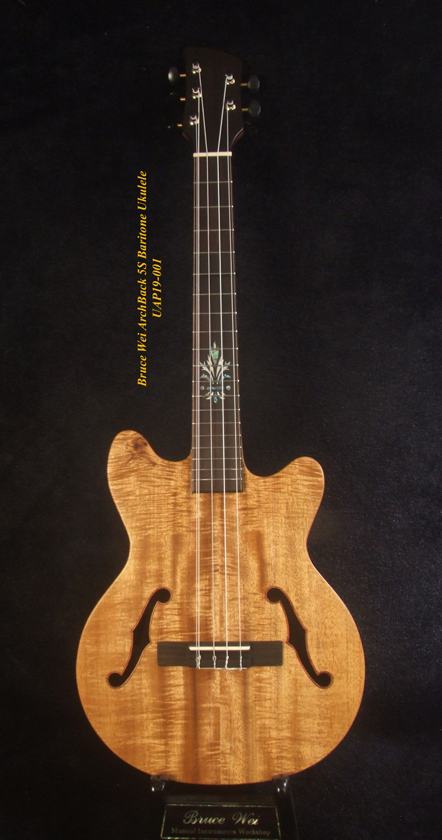 Handcrafted 5 String Baritone Ukulele, Curly Mango, Acacia ArchBack, MOP Inlay, Soft-bag, Bruce Wei UAP19-001