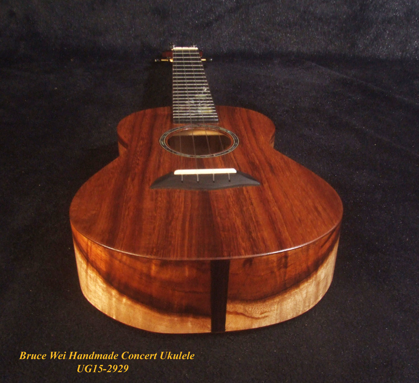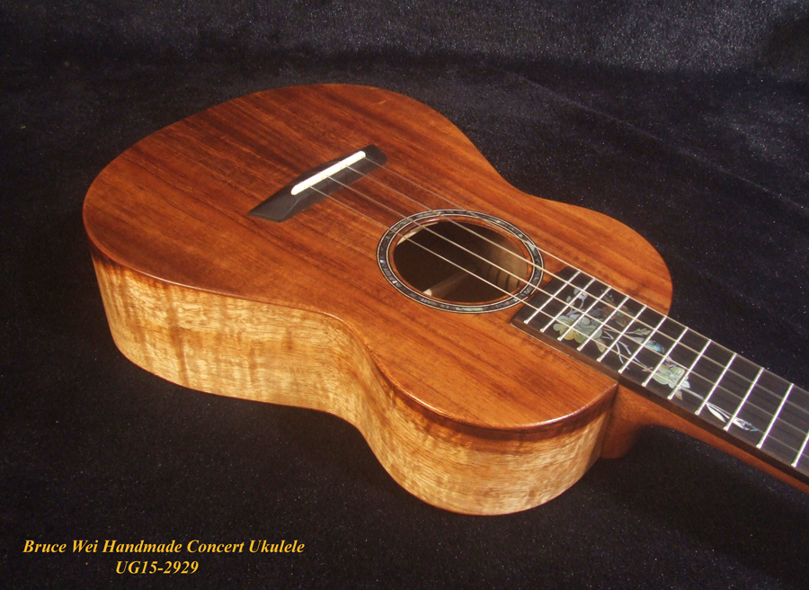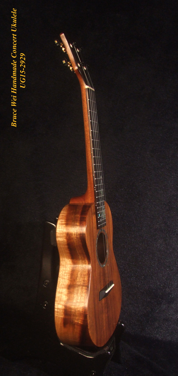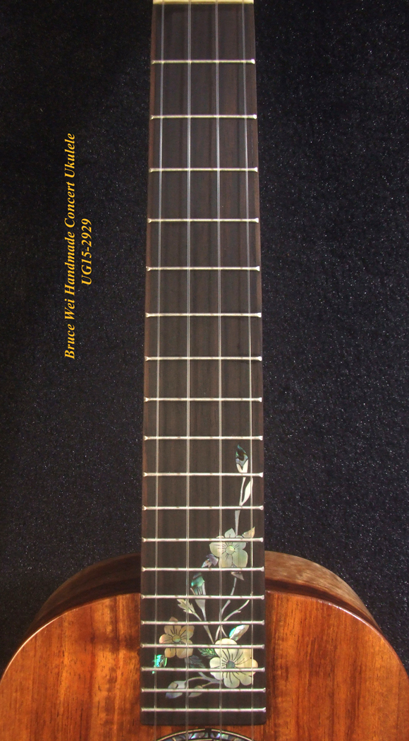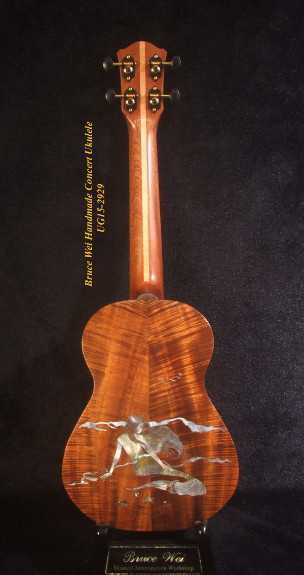 Handcrafted Concert Ukulele, Solid Curly Hawaiian Koa, Mermaid Mop & Abalone Inlay, Bruce Wei UG15-2929