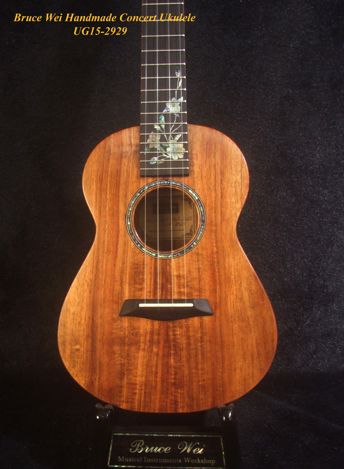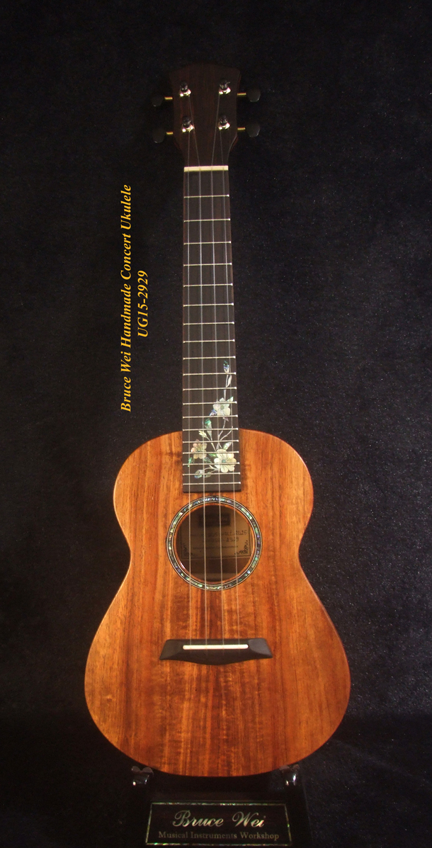 Handcrafted Concert Ukulele, Solid Curly Hawaiian Koa, Mermaid Mop & Abalone Inlay, Soft-bag, Bruce Wei UG15-2929