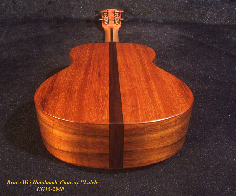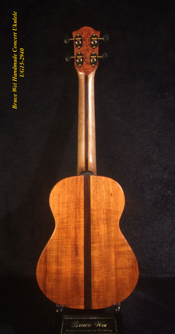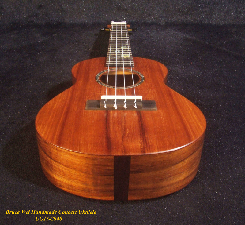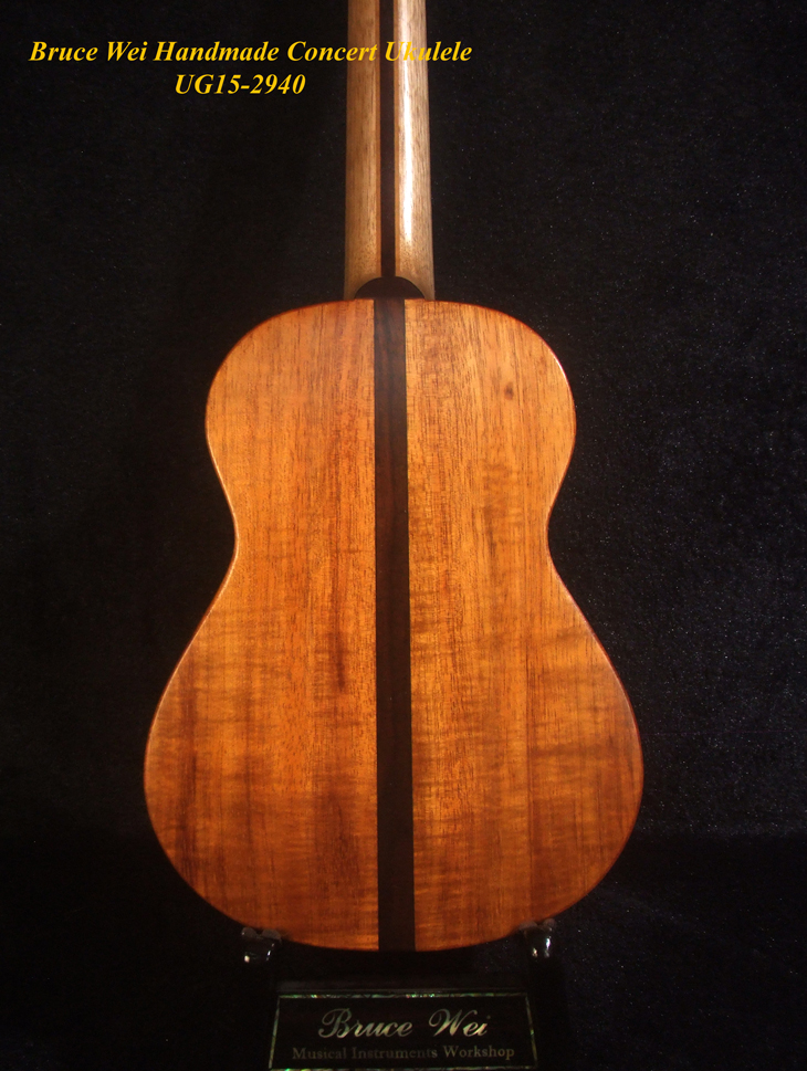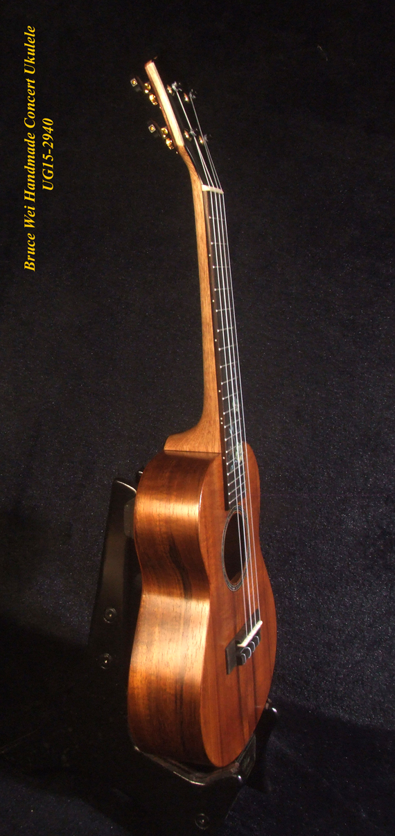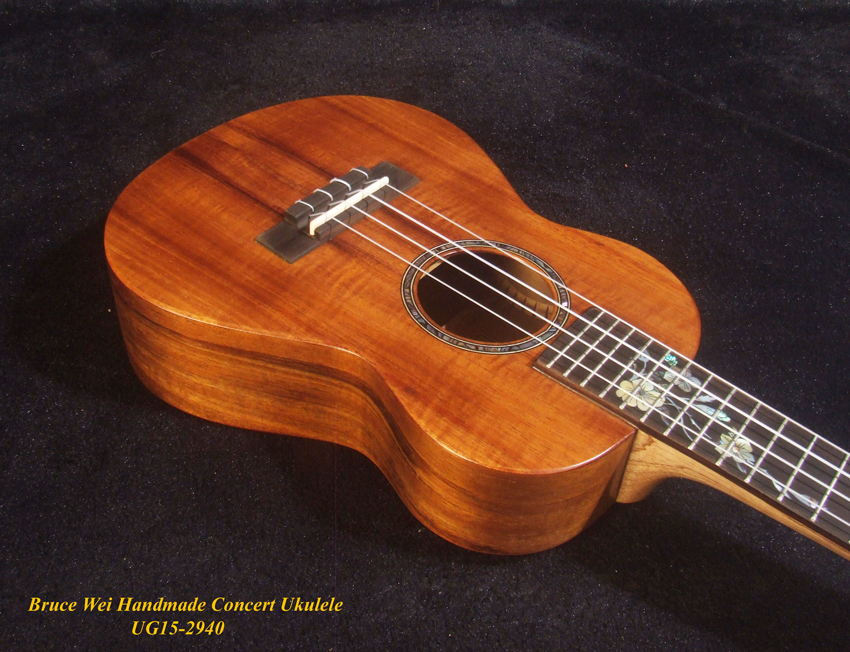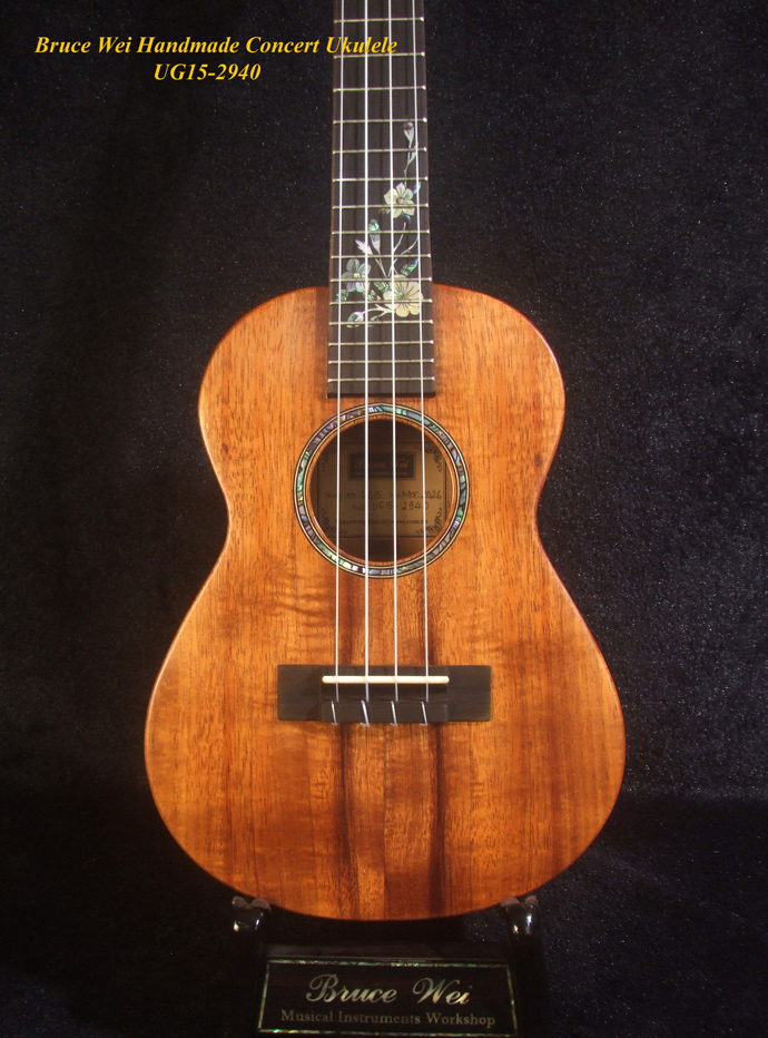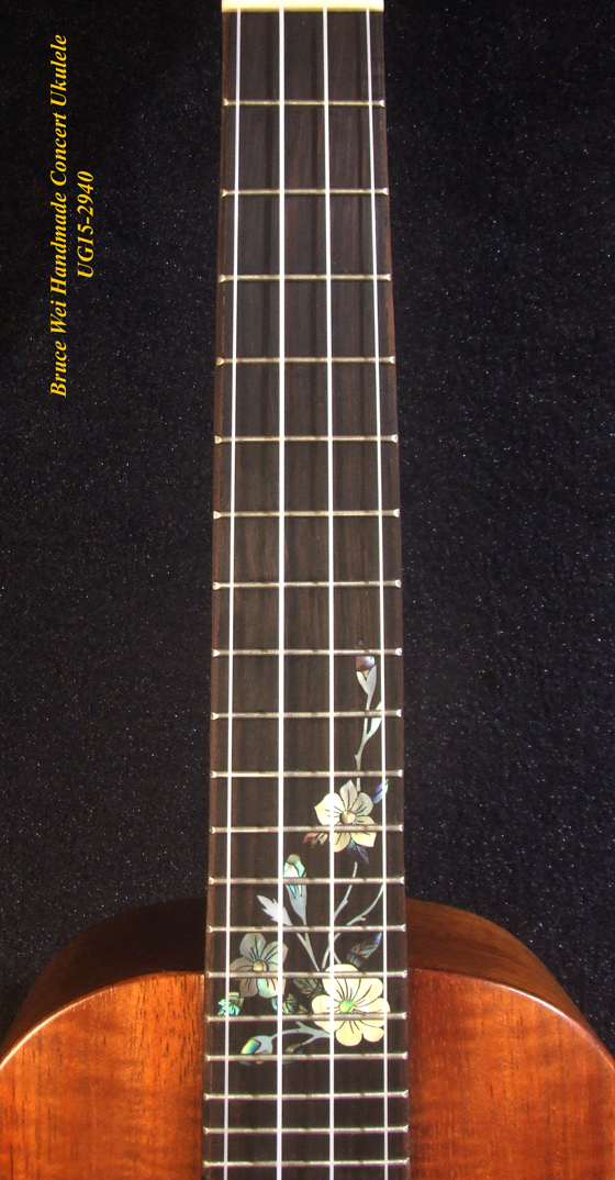 Handcrafted Concert Ukulele, Solid Hawaiian Koa, Mop & Abalone Floral Inlay, Soft-bag, Bruce Wei UG15-2940