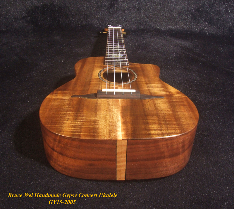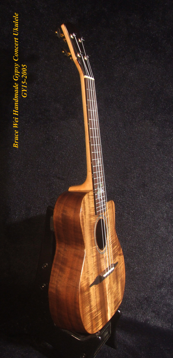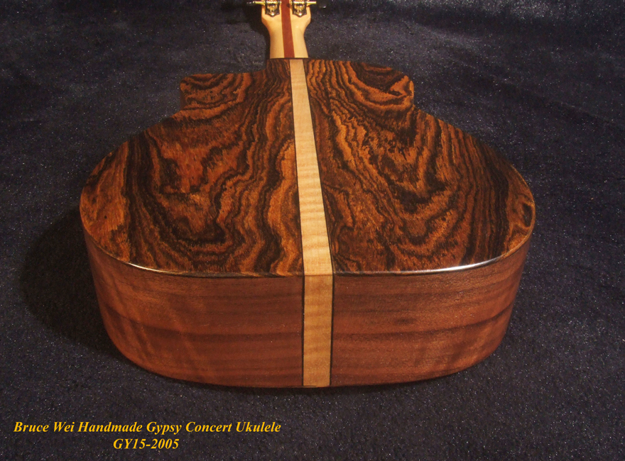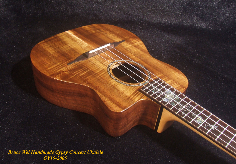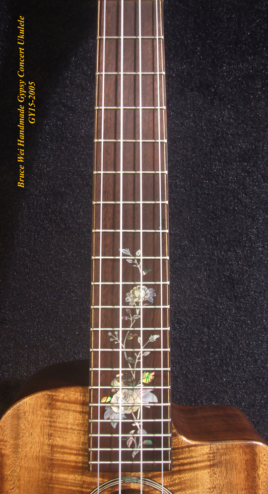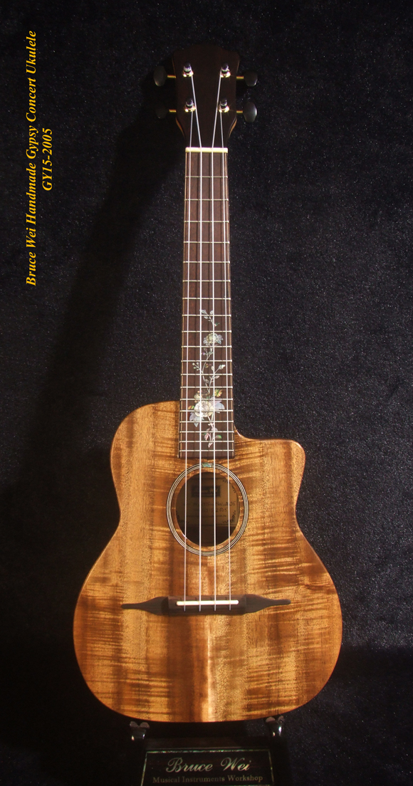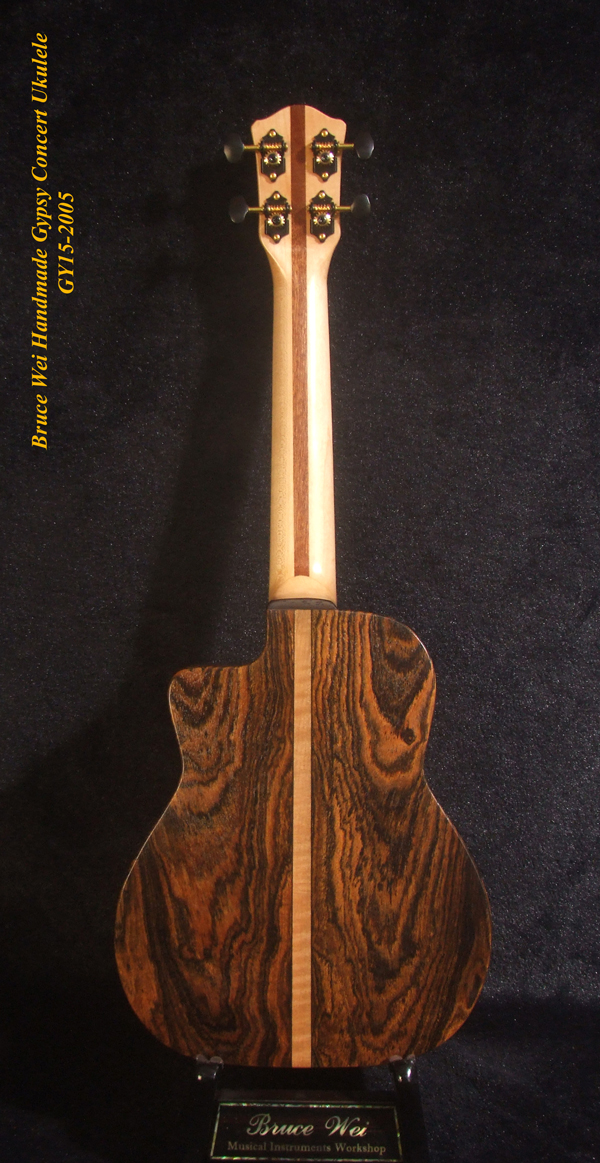 Handcrafted Gypsy Concert Ukulele, Solid Curly Acacia, Bocote, Floral Inlay, Soft-bag, Bruce Wei GY15-2005