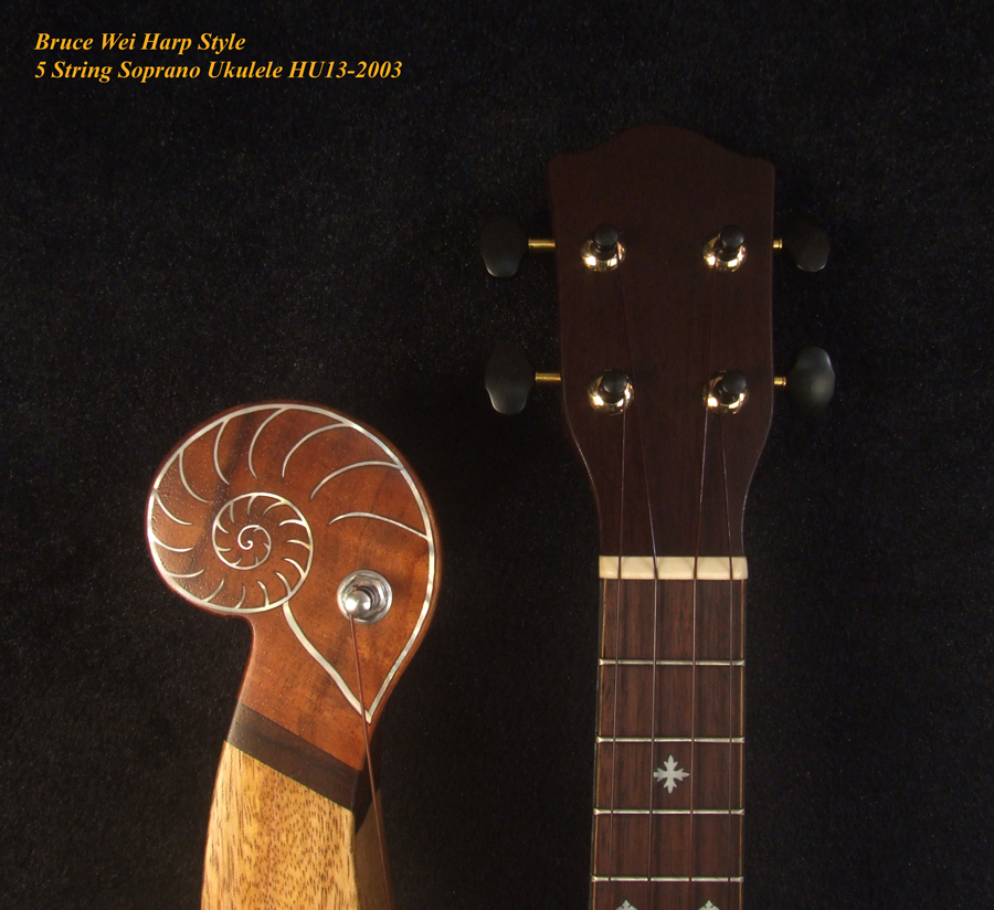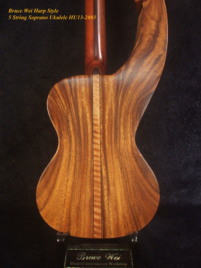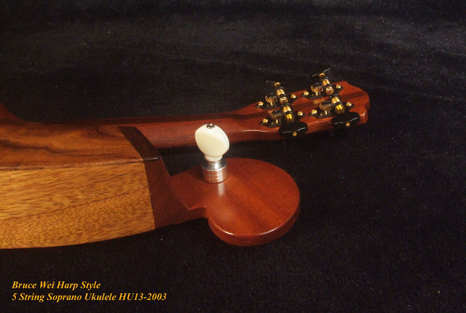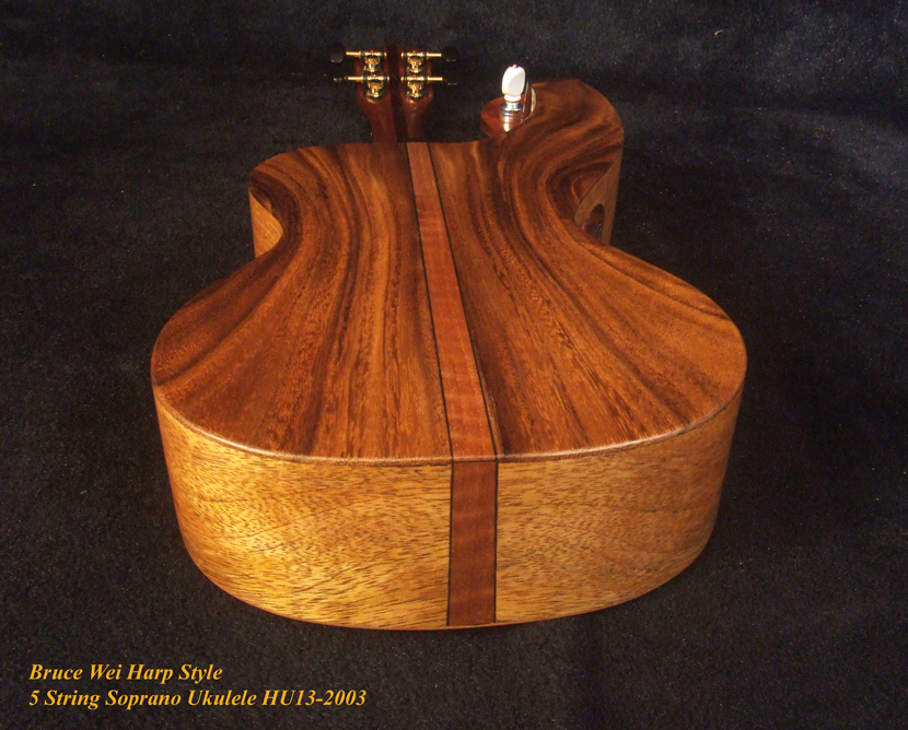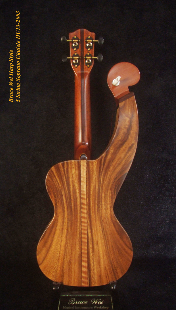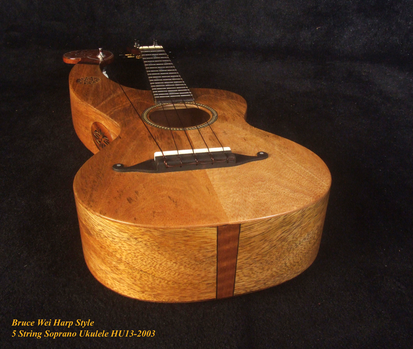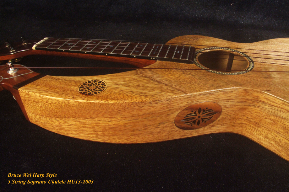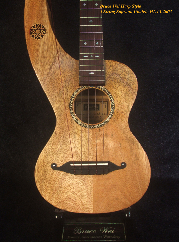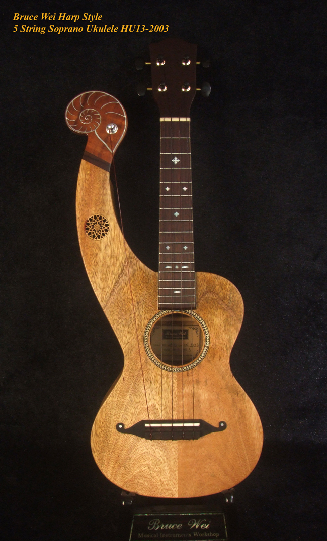Handcrafted Harp Style 5 String Soprano Ukulele, Bruce Wei ,Solid Acacia, Mango HU13-2003
