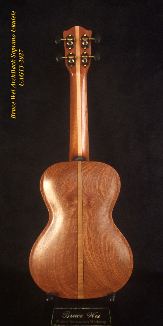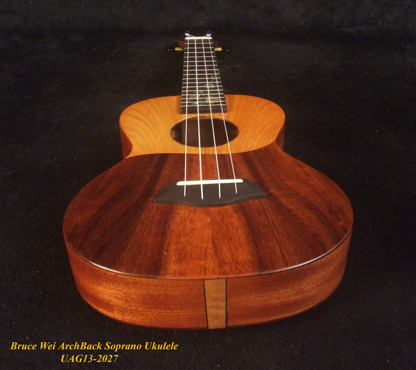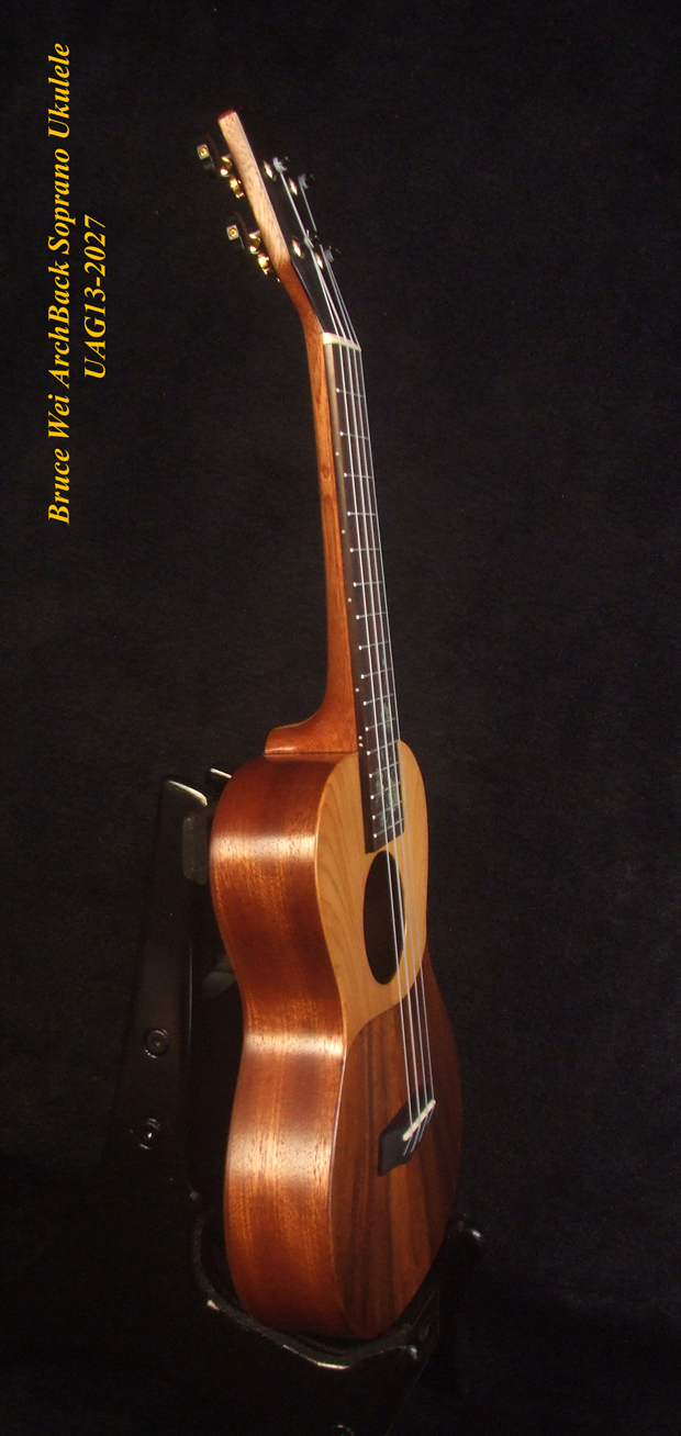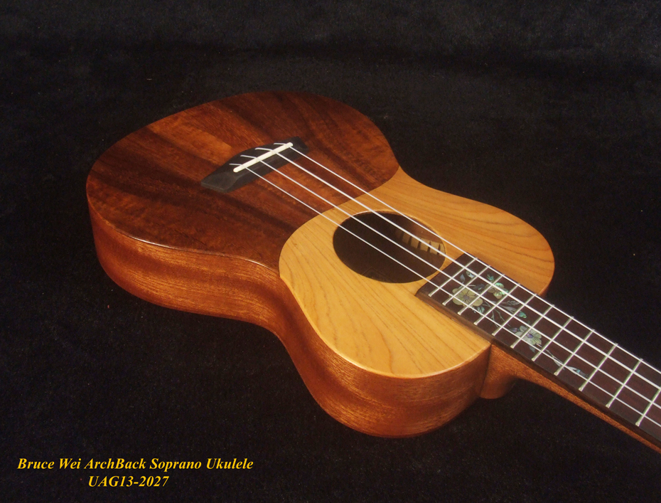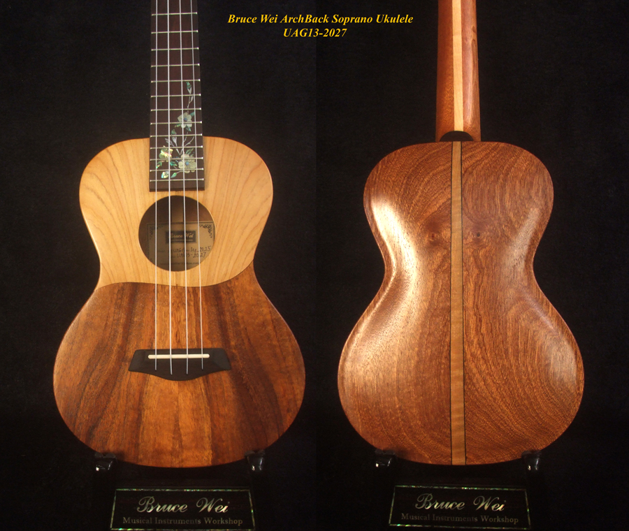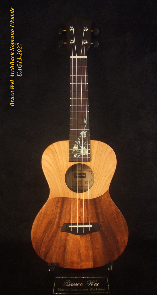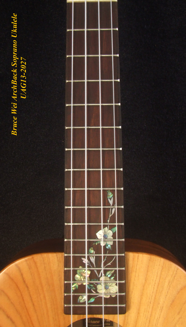 Handcrafted Soprano Ukulele Hawaiian Koa & Mahogany Archback, Floral inlay, Soundhole, Soft-bag, Bruce Wei UAG13-2027