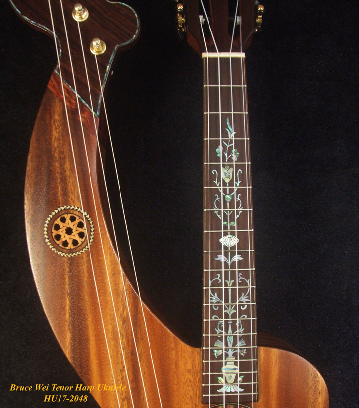 Handcrafted Tenor Harp Ukulele, Solid Acacia, Classic pattern Abalone & MOP Inlay, Hard Case, Bruce Wei HU17-2048