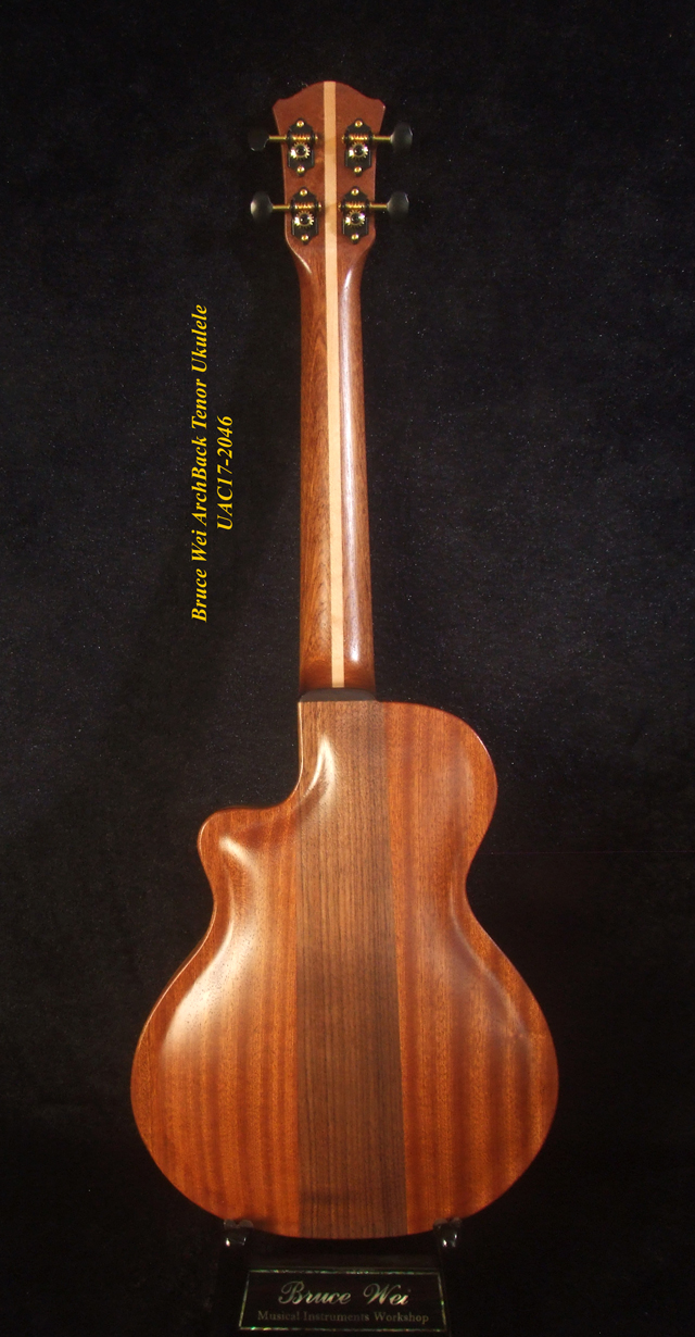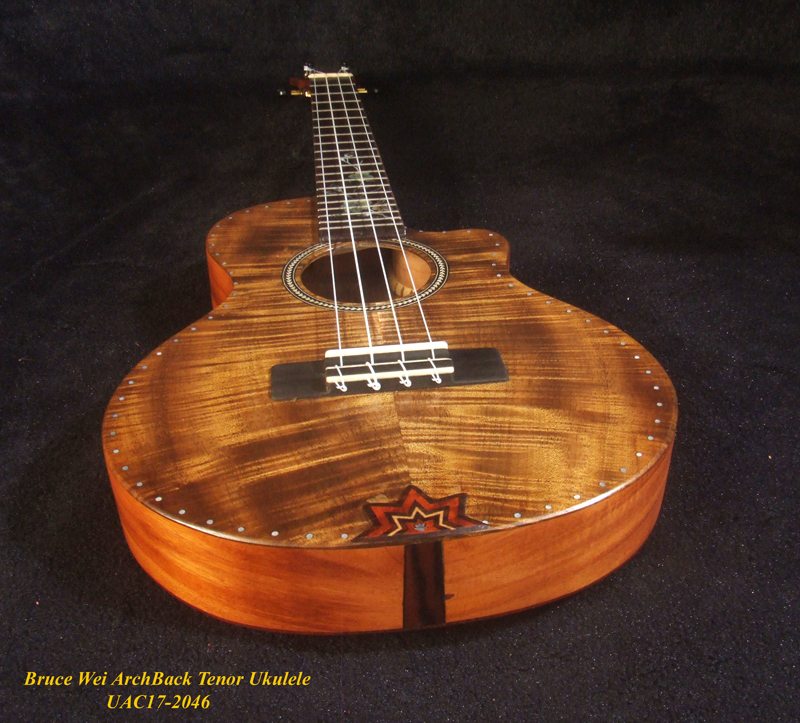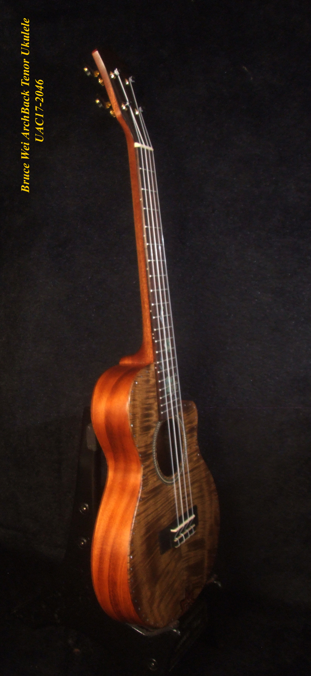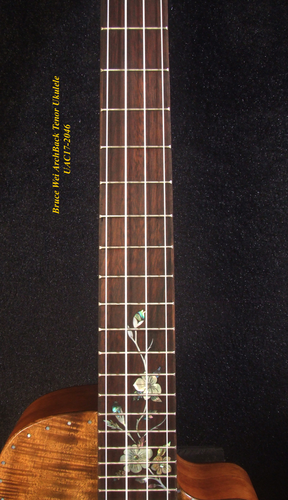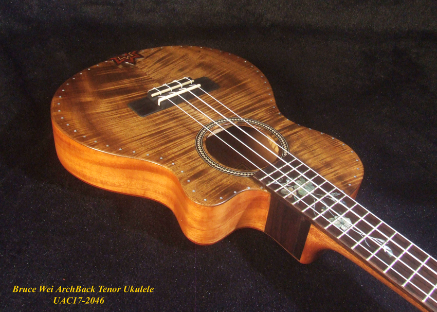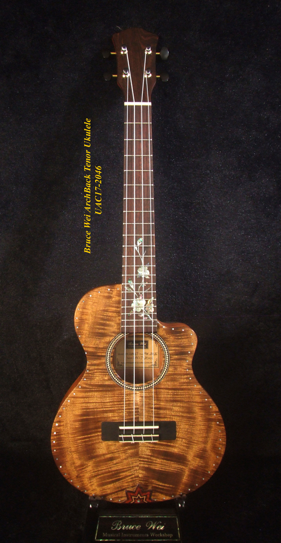 Handcrafted Tenor Ukulele, Carved ARCHBACK Solid Curly Acacia, Mahogany, Floral Inlay, Soft-bag, Bruce Wei UAC17-2046