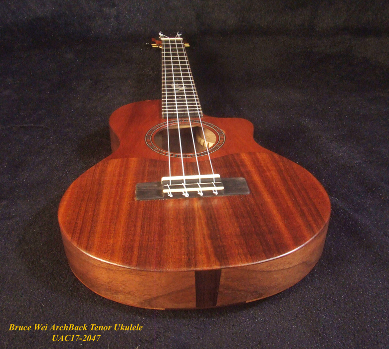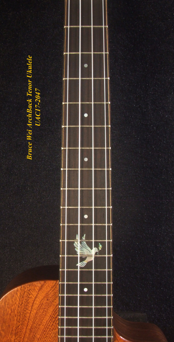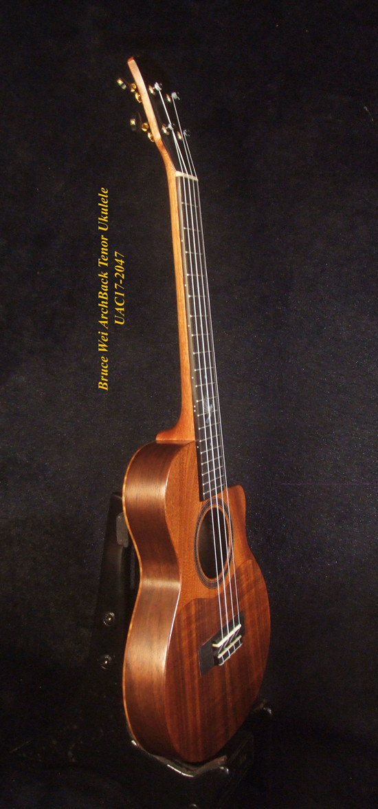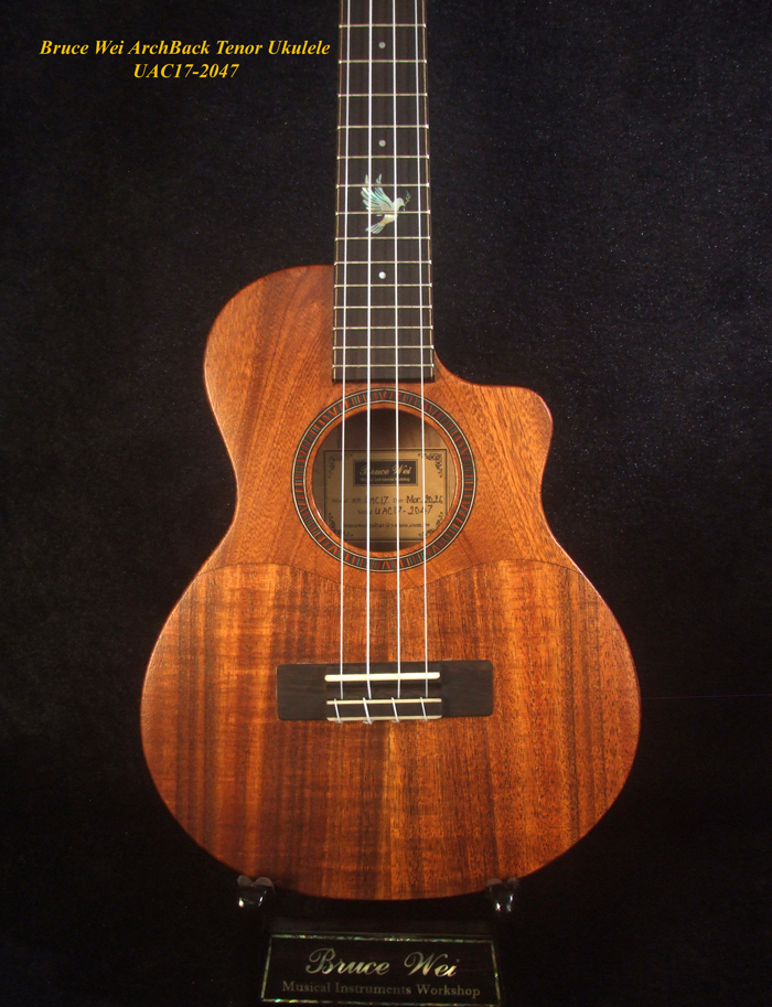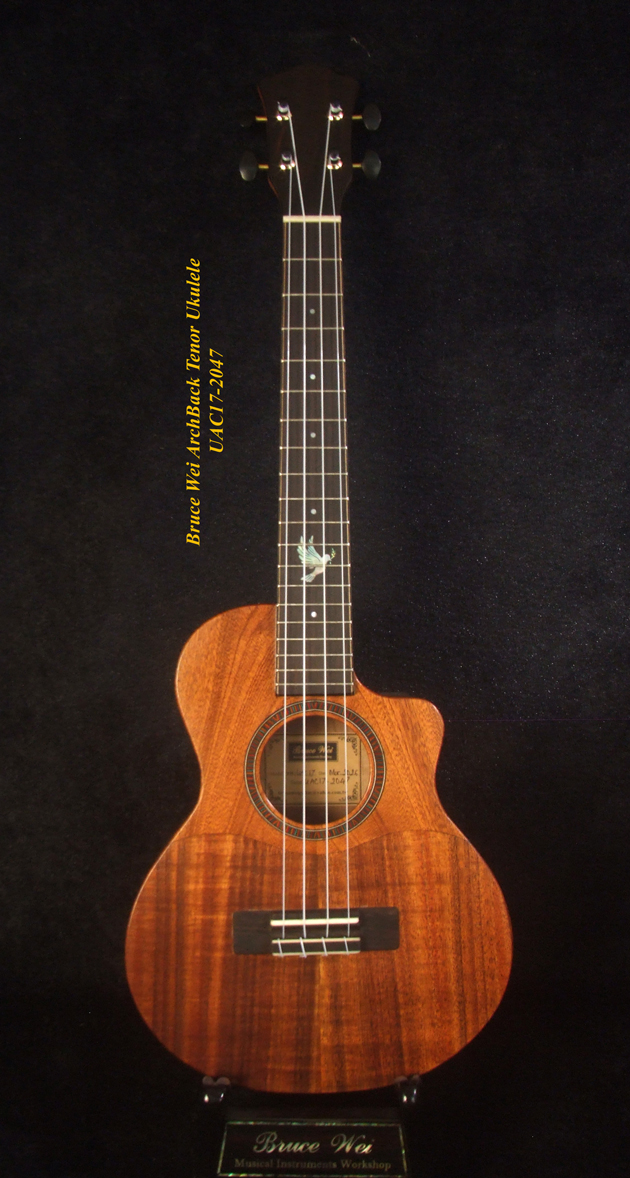 Handcrafted Tenor Ukulele, Carved ARCHBACK Solid Hawaiian Koa, Flame Maple, Bird Inlay, Bruce Wei UAC17-2047