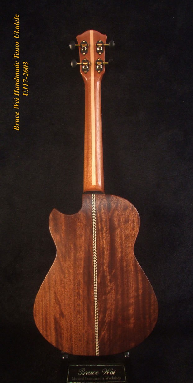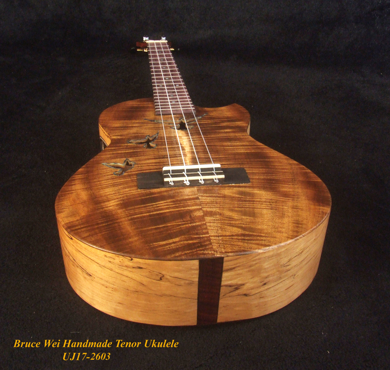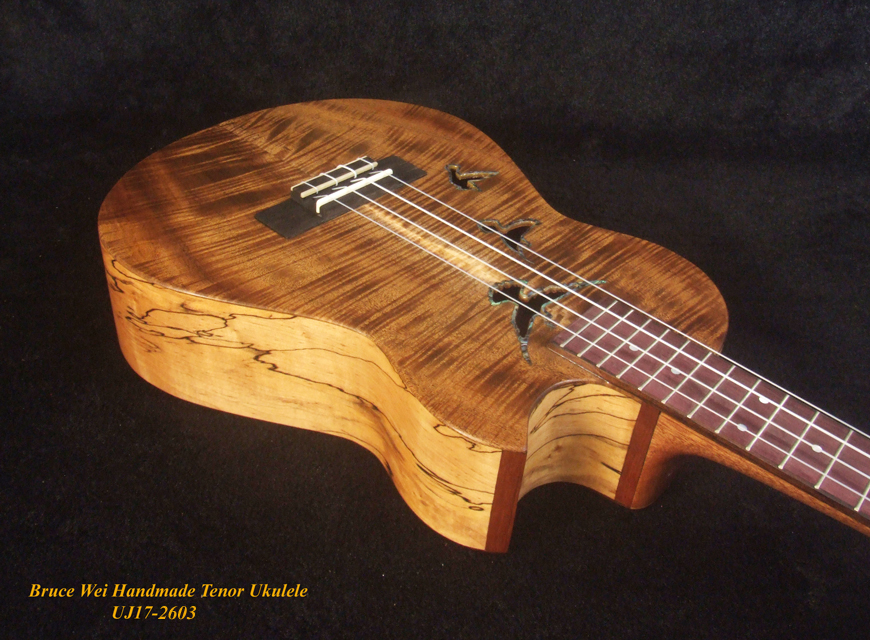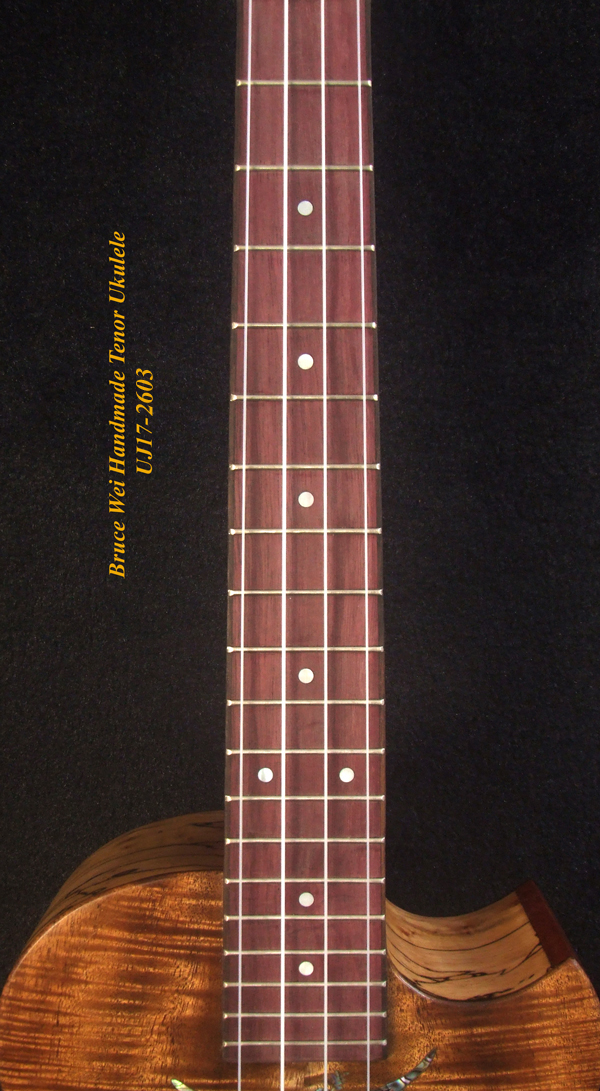Handcrafted Tenor Ukulele, Solid Curly Acacia, Mahogany, Doves Soundhole, Abalone Inlay, Soft-bag, Bruce Wei UJ17-2603