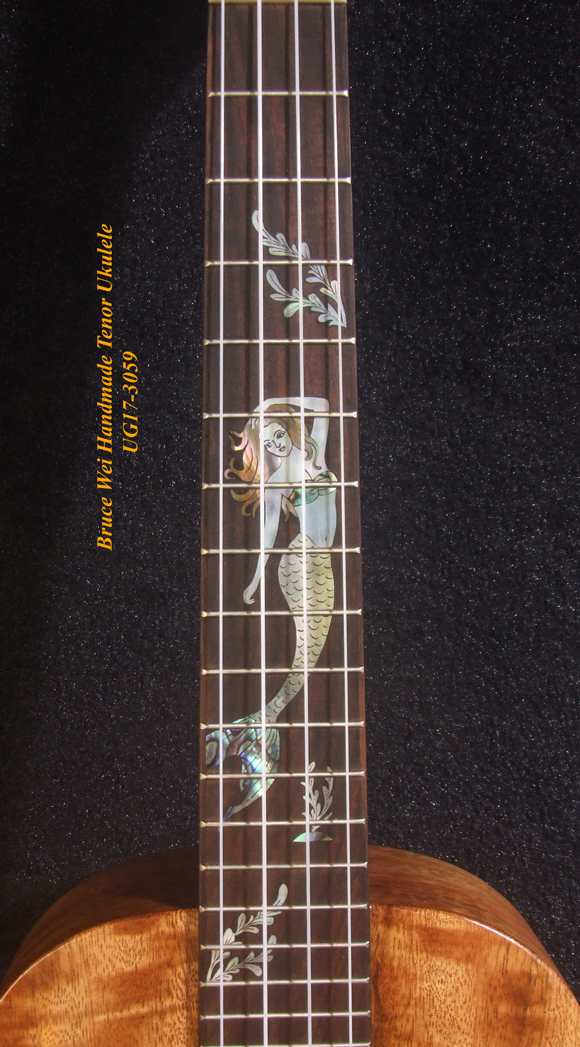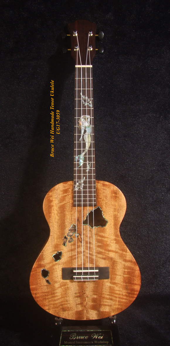 Handcrafted Tenor Ukulele, Solid Curly Mango & Burl wood, The Islands Soundhole, Mermaid inlay, Soft-bag, Bruce Wei UG17-3059