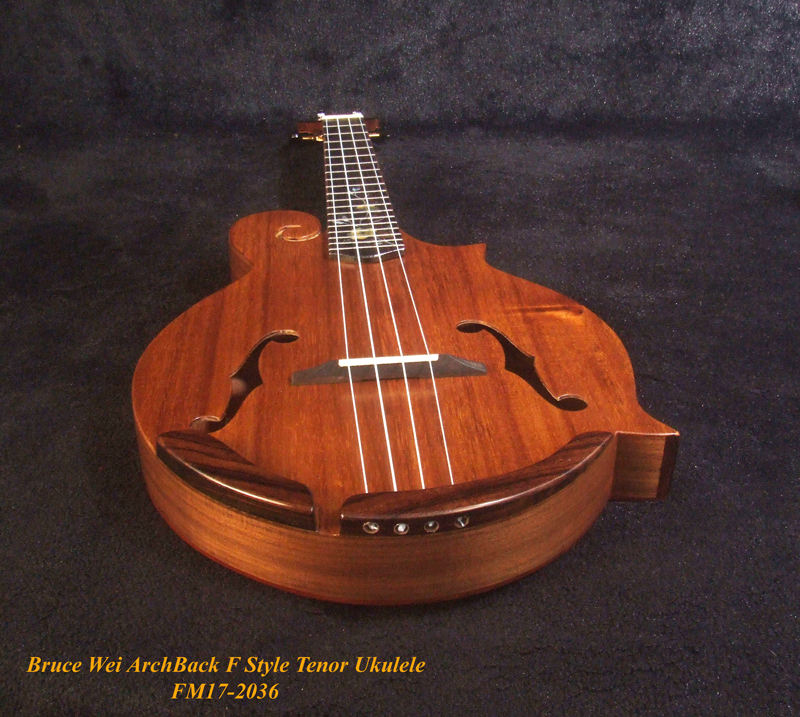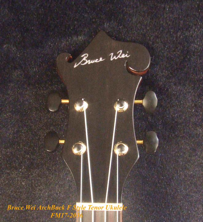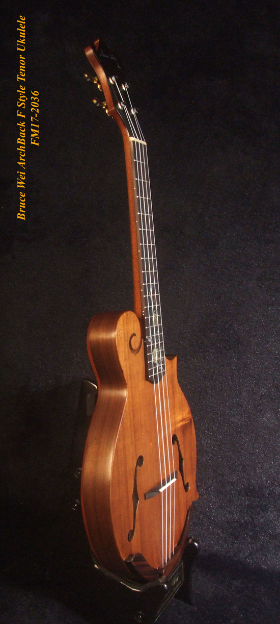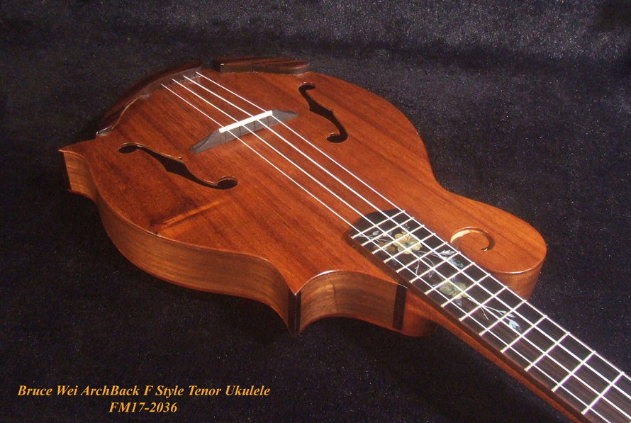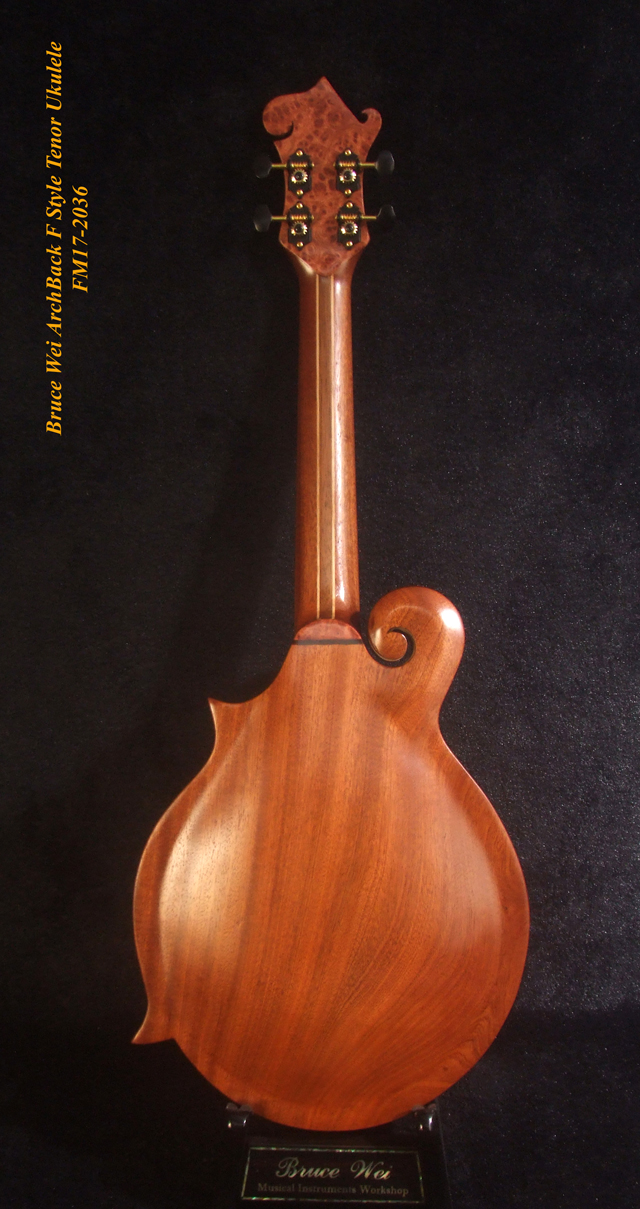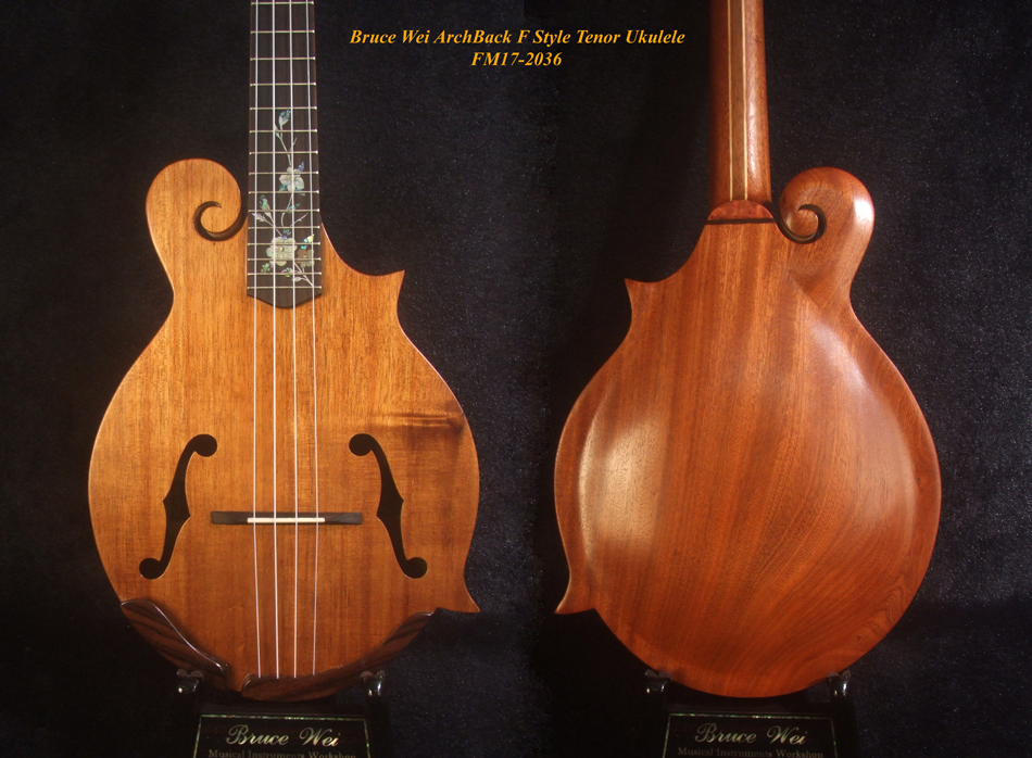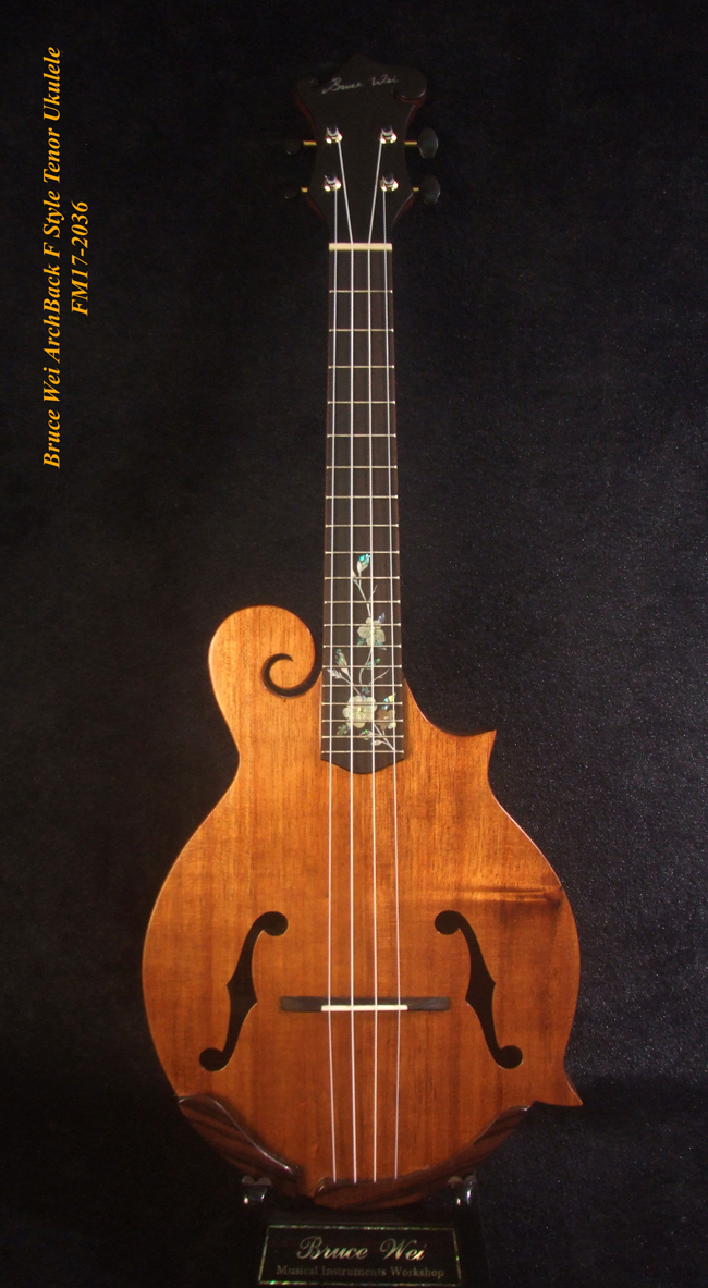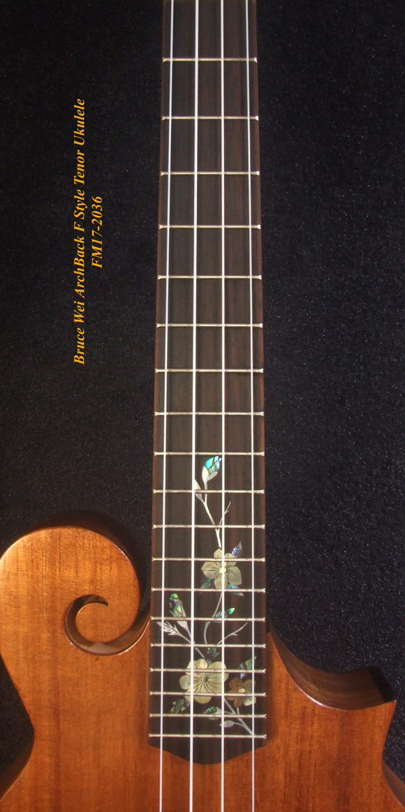 Handmade F Style Tenor Ukulele, ArchBack, Hawaiian Koa & Mahogany, Floral Inlay, Soft-bag, Bruce Wei FM17-2036