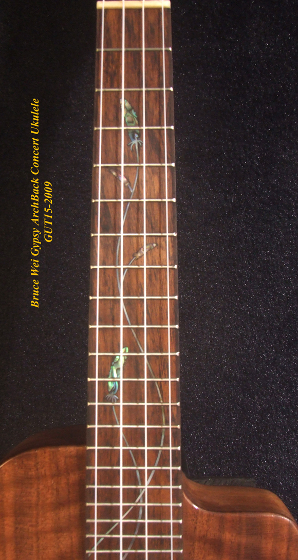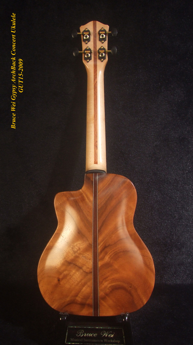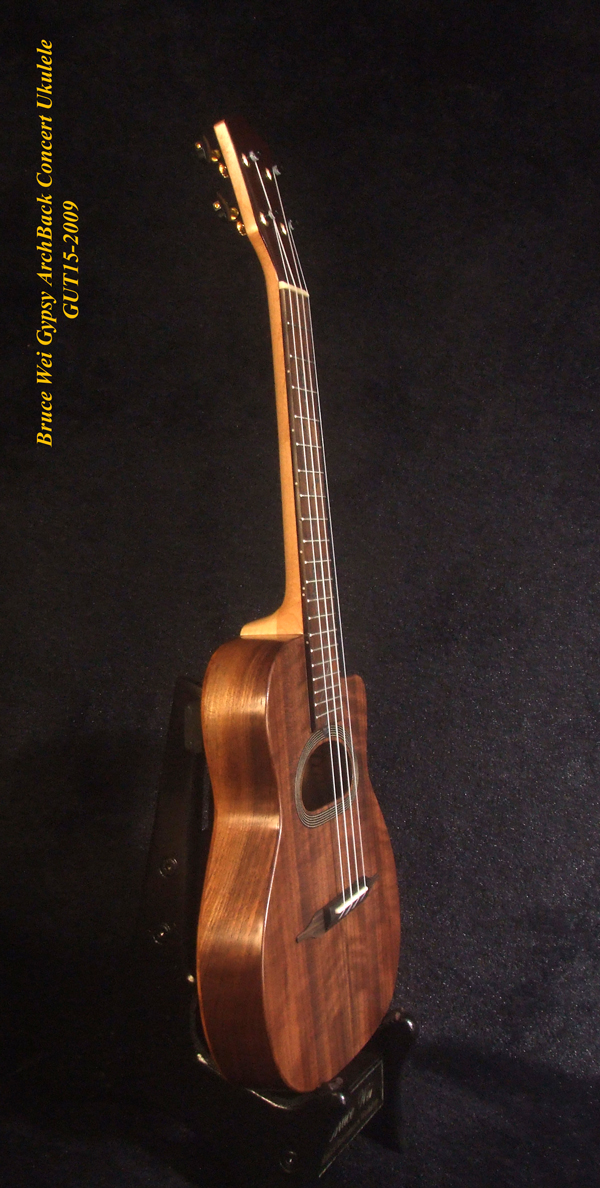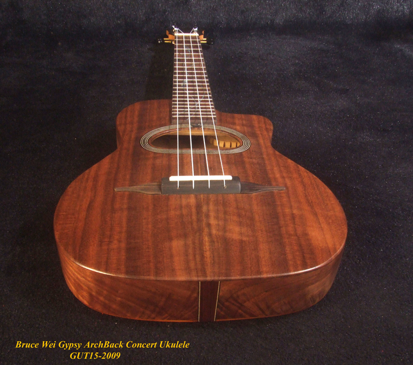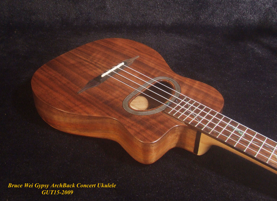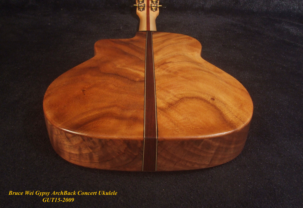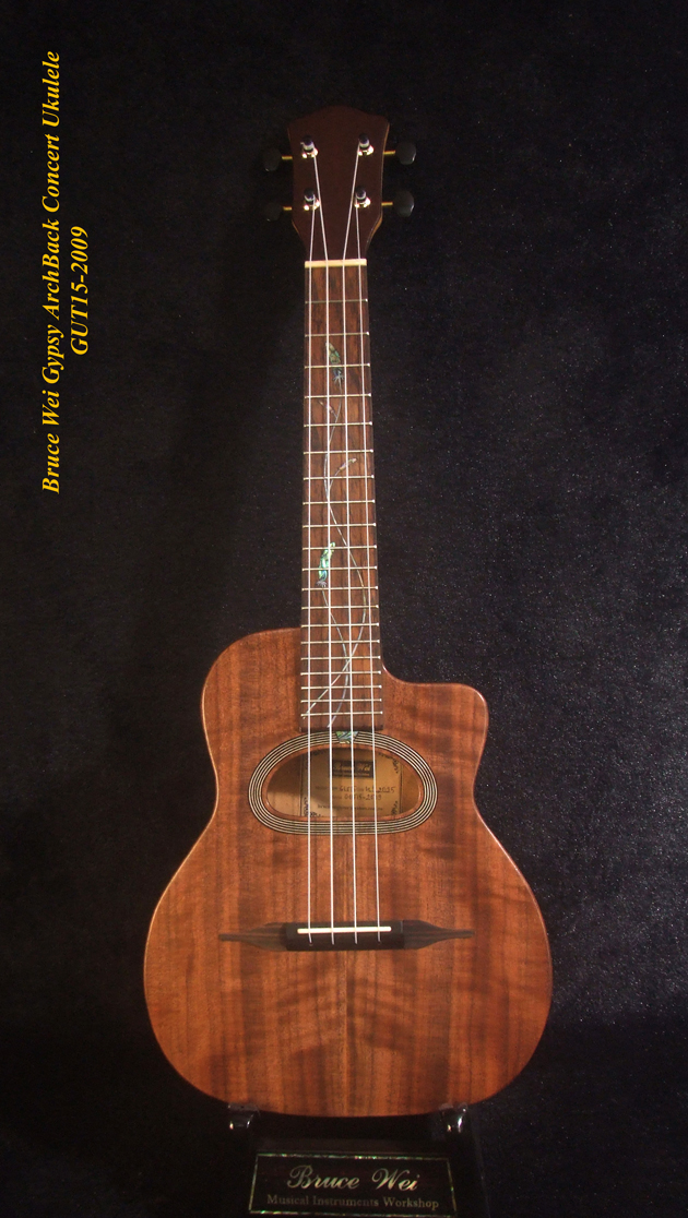 Handmade Gypsy Concert Ukulele, ArchBack Curly Wanut, Acacia MOP & Abalone Inlay, Soft-bag, Bruce Wei GUT15-2009