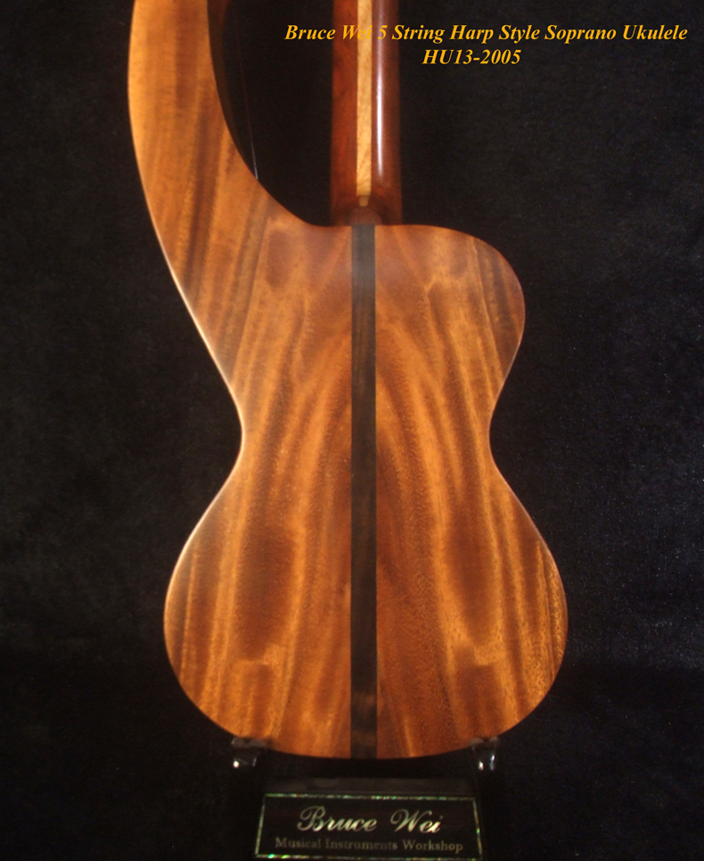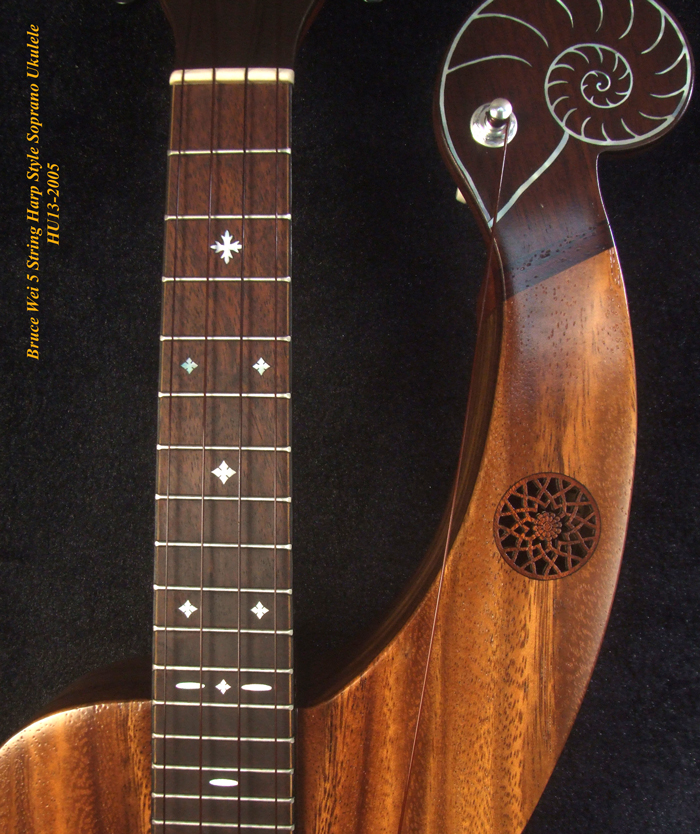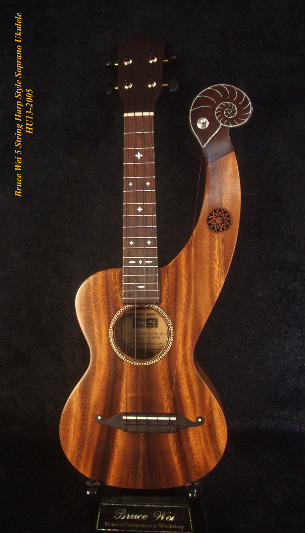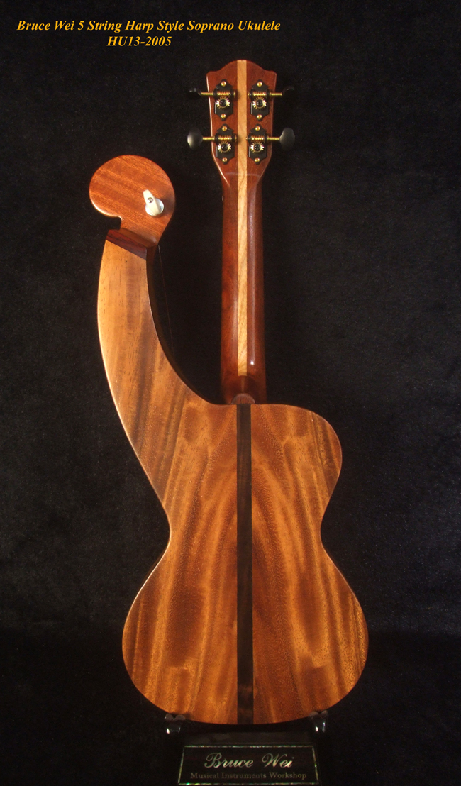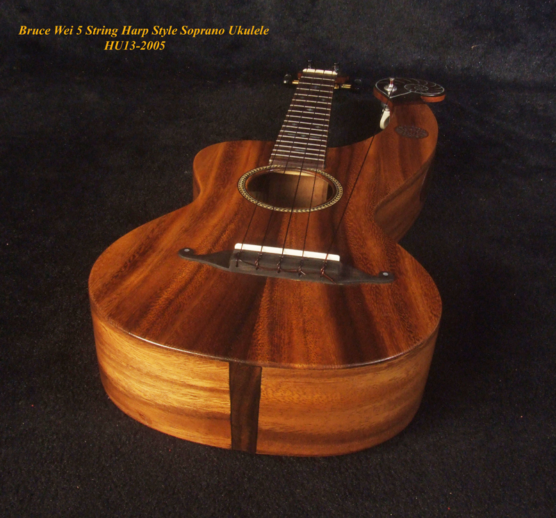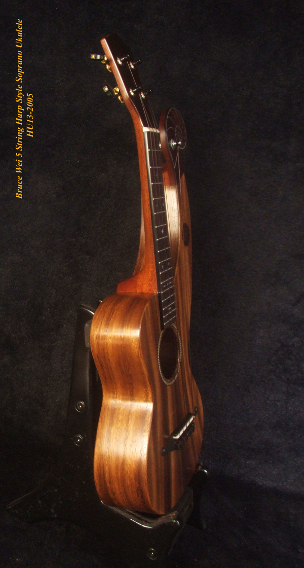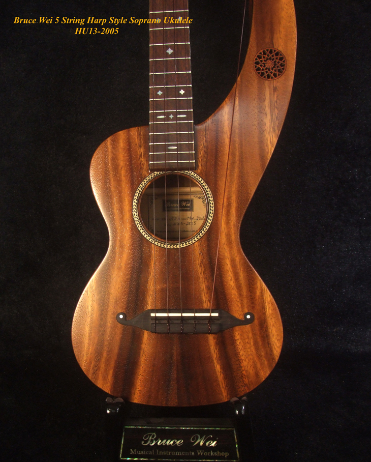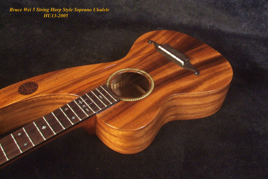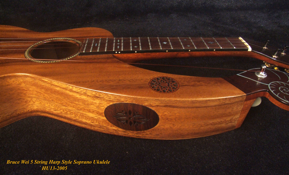 Handmade Harp Style Left-handed 5 String Soprano Ukulele, Solid Acacia, MOP Inlay, Bruce Wei HU13-2005