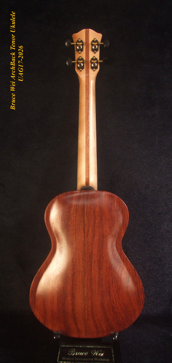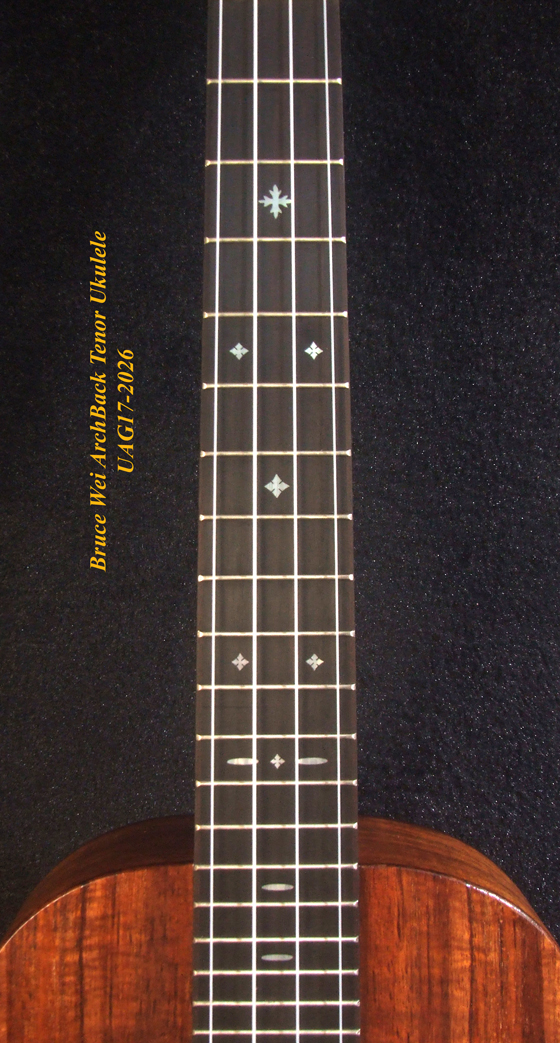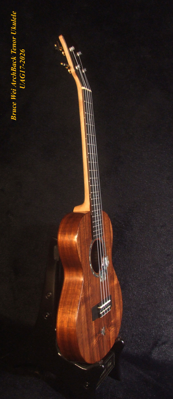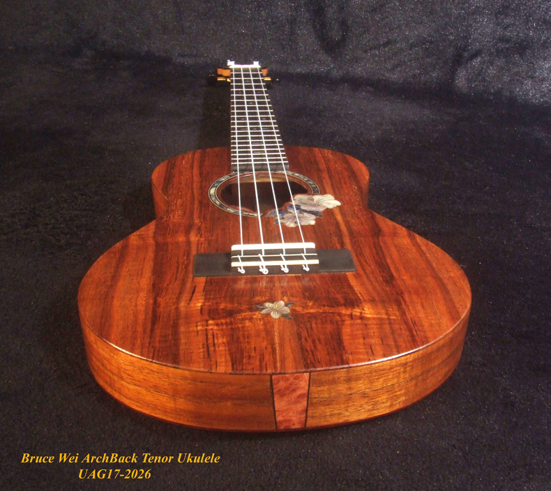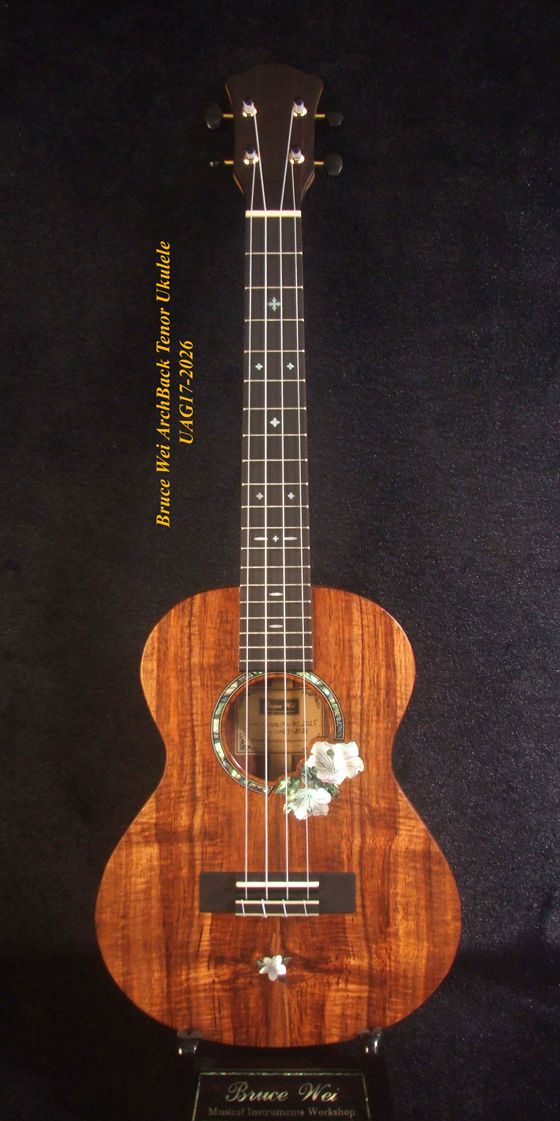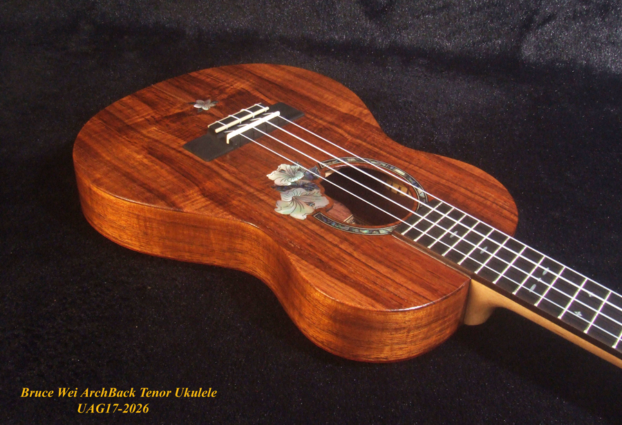 Handmade Solid Hawaiian Koa Tenor Ukulele, Rosewood Arch-Back, Hibiscus Abalone, MOP Inlay, Soft-bag, Bruce Wei UAG17-2026