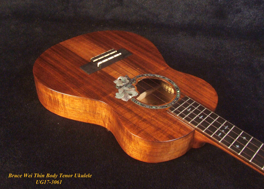 Handmade Thin Body Tenor Ukulele, Solid Hawaiian Koa, Hibiscus Soundhole, Inlay, Bruce Wei UG17-3061