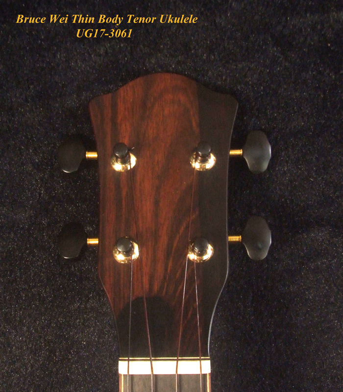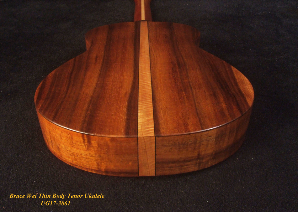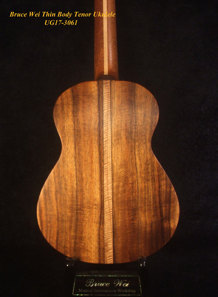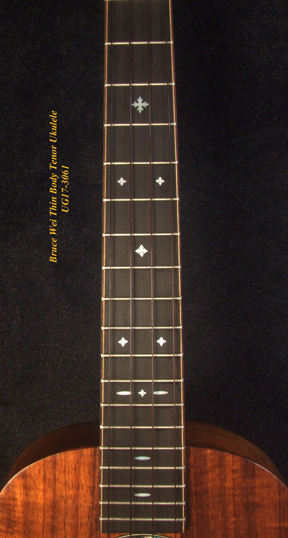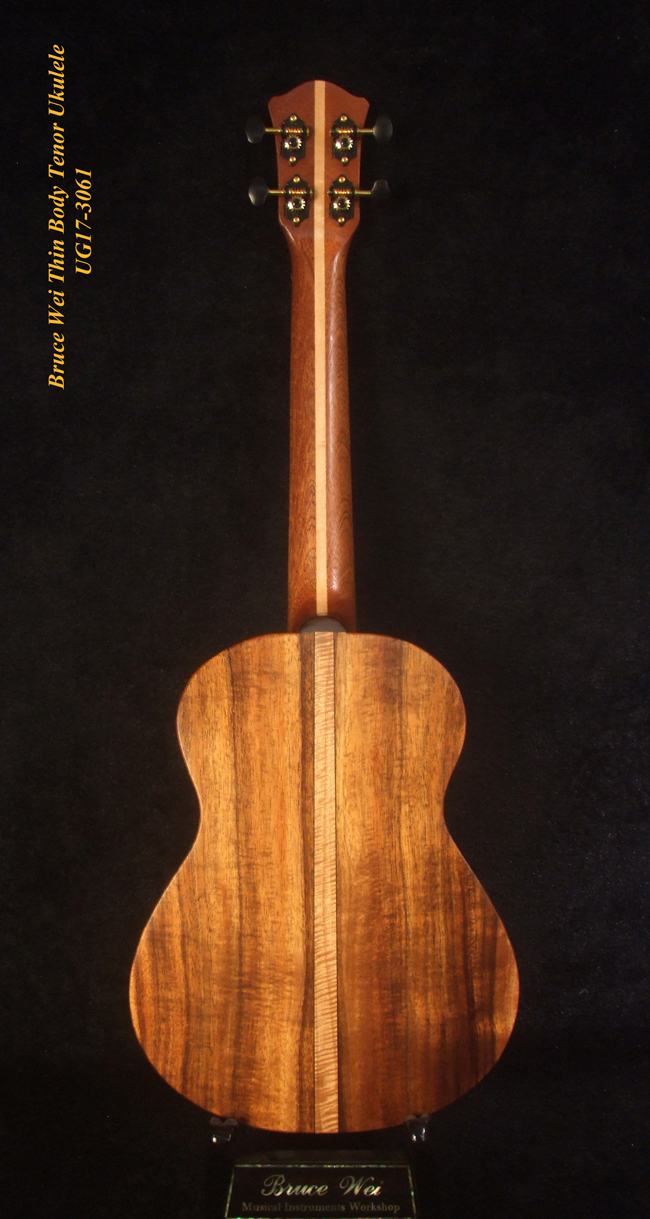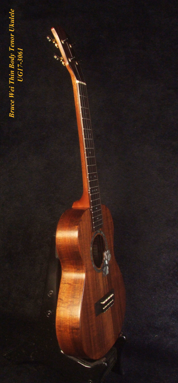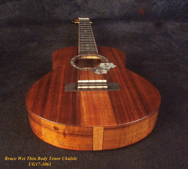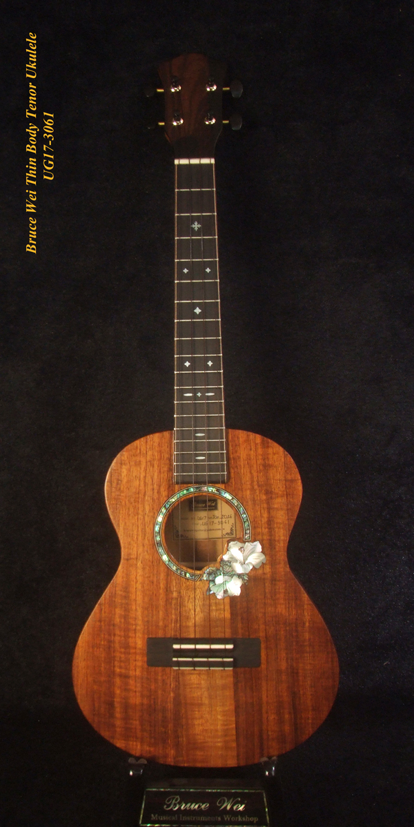 Handmade Thin Body Tenor Ukulele, Solid Hawaiian Koa, Hibiscus Soundhole, Inlay, Soft-bag Bruce Wei UG17-3061